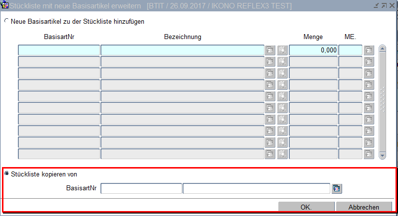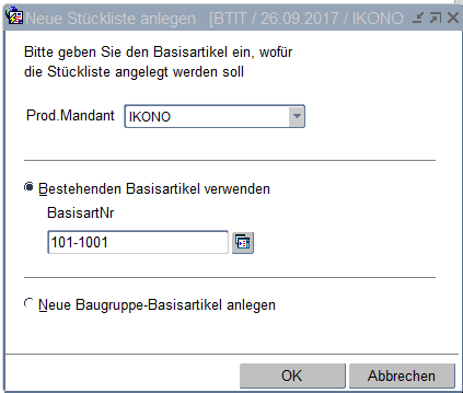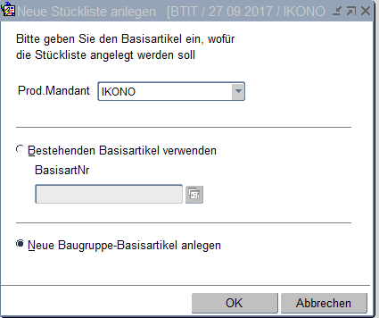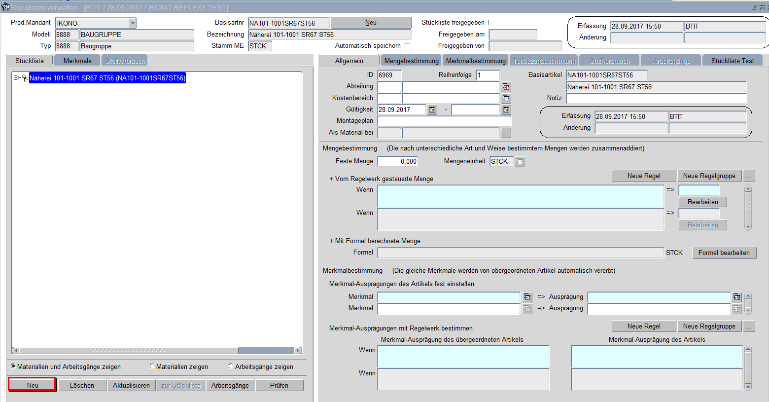 Über den Button „NEU“ öffnet sich das Fenster „Neue Stückliste anlegen“