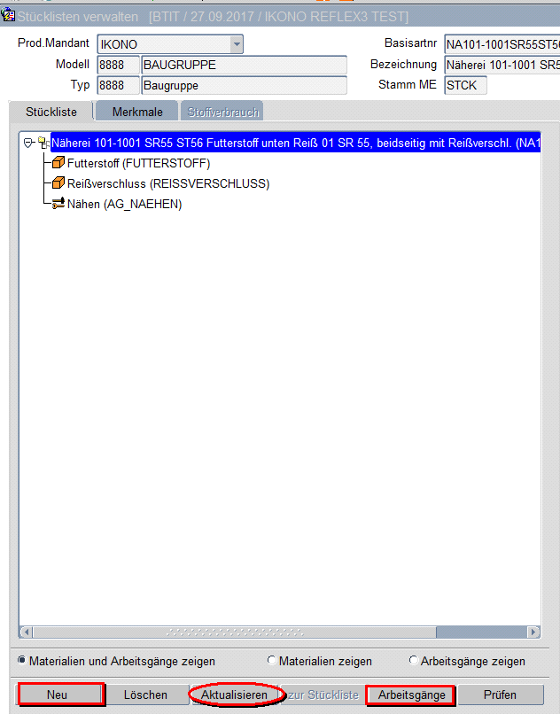 Mit einem Doppelklick wechselt man in die Baugruppe, die bearbeitet werden soll. Hier können dann Materialien, weitere Baugruppen (jeweils über den Button „Neu“) oder Arbeitsgänge (Button Arbeitsgänge“ hinzugefügt werden. Mit dem Button „Aktualisieren“ werden die hinzugefügten Positionen angezeigt.