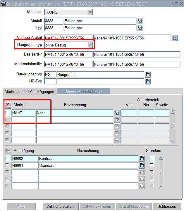 Über die Button „Artikel erstellen“ und „Artikel aktivieren“ wird die Baugruppe erstellt.