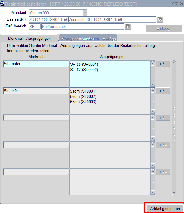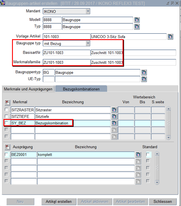 Die Baugruppe Zuschnitt hat den Baugruppentyp „mit Bezug“ und gleichzeitig das Merkmal „Bezugskombination“