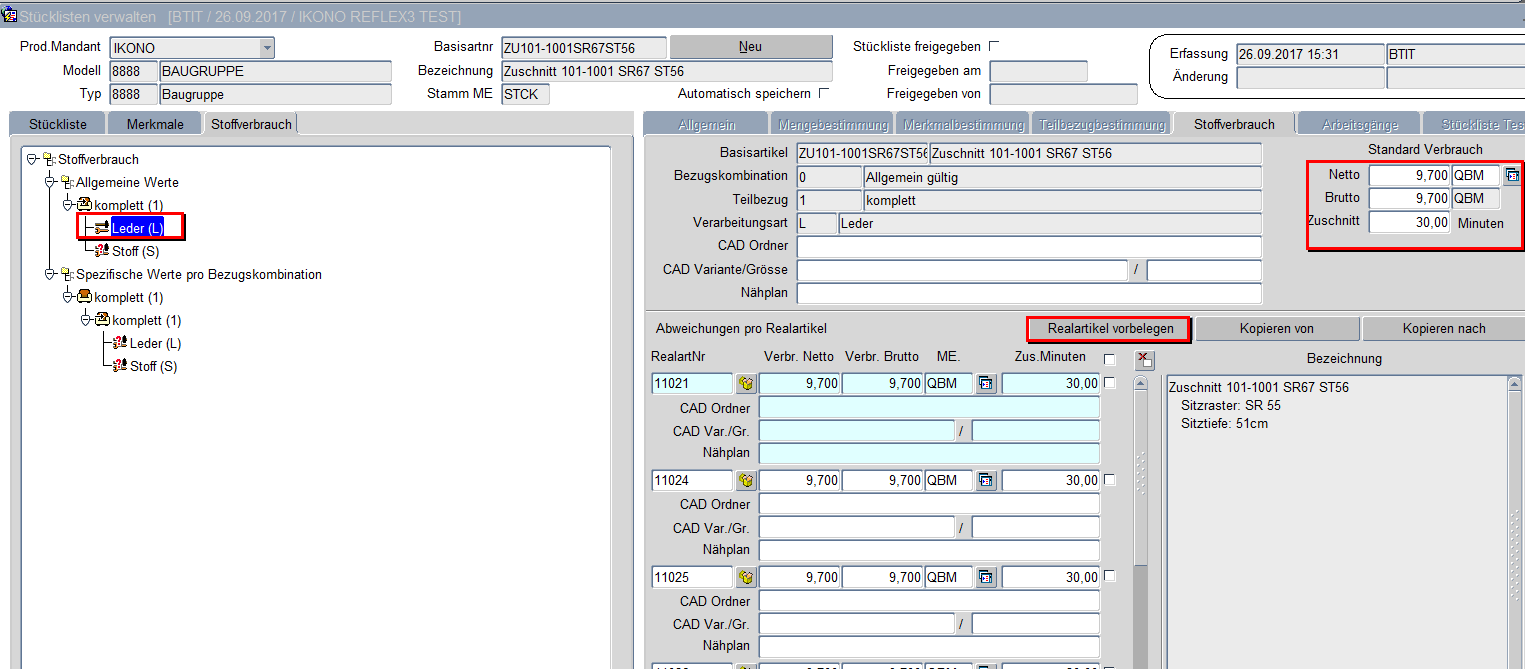Die Stoff/Lederverbräuche werden in der Registerkarte Stoffverbrauch erfasst, indem man auf die entsprechende Verarbeitungsart in der Baumstruktur klickt (erst dann sind die Felder im Eingabemodus) und danach die Verbräuche und die Zuschnittminuten anlegt. Dann können diese Werte für sämtliche stoffverbrauch-relevanten Merkmale vorbelegt werden, indem der Button Realartikel vorbelegen geklickt wird. Diese Werte werden dann händisch nachgepflegt.