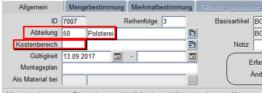 In den verschiedenen Baugruppen befinden sich die Kalkulationsbereiche (z. b. Armlehnen und Füße), die in der Kalkulation gezogen werden. Es wird immer der Kalkulationsbereich des Materials, des Arbeitsganges bzw. der übergeordneten Baugruppe gezogen. Außerdem befinden sich dort die Abteilungen, die bei der Fertigmeldung gezogen werden. Es wird für die Materialabbuchung immer die Fertigmelde-Abteilung des Materials oder des Arbeitsganges gezogen. Ist das Feld Abteilung hier leer, wird die Abteilung der übergeordneten Baugruppe gezogen.