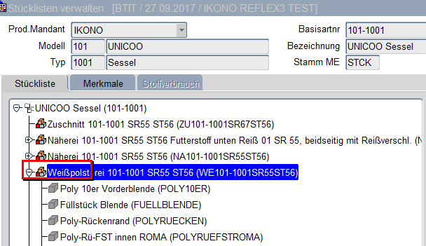 Materialien oder Arbeitsgänge einer Baugruppe können immer nur in dieser Baugruppe auch gelöscht oder hinzugefügt werden. Auch die Registerkarten zur entsprechenden Gruppe können hier angepasst werden. Mit einem Doppelklick auf die Baugruppe in der Baumstruktur wechselt man direkt in dessen Stückliste.