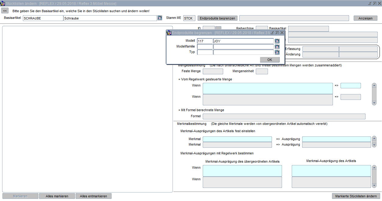 Für die materialbezogene Änderung verschiedener Stücklisten muss im ersten Feld der Basisartikel gewählt werden, um den es sich bei den Änderungen handelt. Sollen nur die Stücklisten eines Modells, einer Modellfamilie oder eines Typs angepasst werden, so kann man mit dem Button "Endprodukte begrenzen" die Stücklisten entsprechend eingrenzen. Mit der Betätigung des Buttons "Anzeigen" ganz rechts werden dann alle betroffenen Stücklisten aufgelistet.