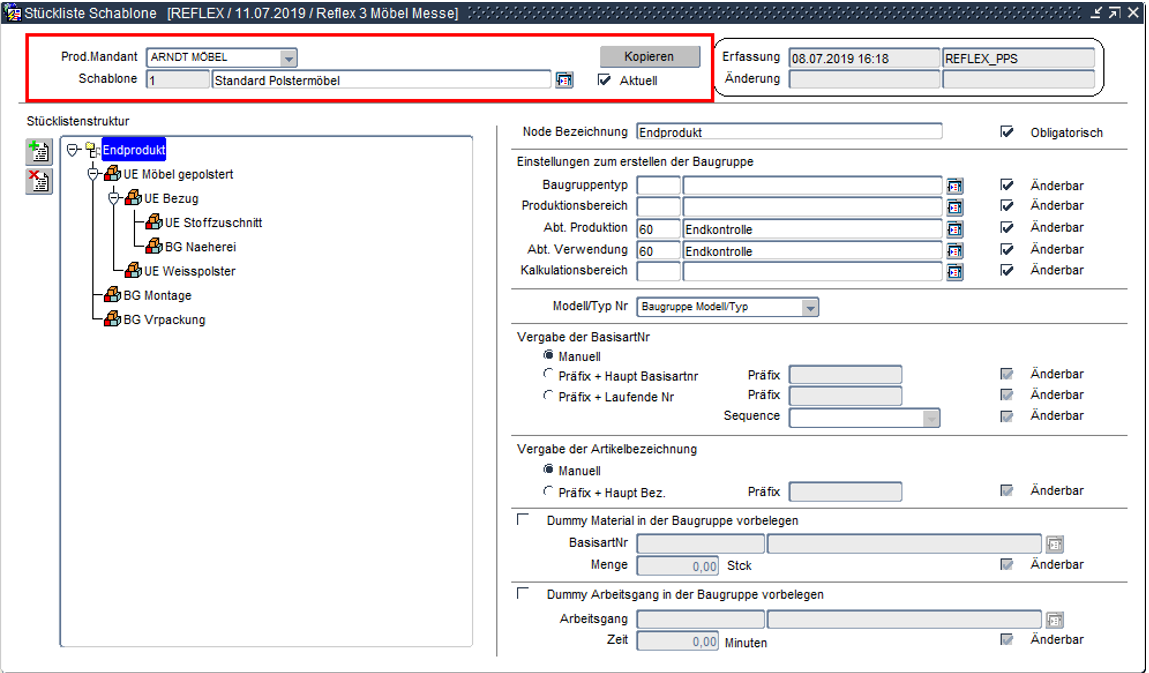 Für die Baugruppe besteht die Möglichkeit ein Dummy Material / Arbeitsgang festzulegen, welcher grundsätzlich in der Baugruppe vorhanden sein muss und in die Stücklistenvorbereitung übergeben werden soll.