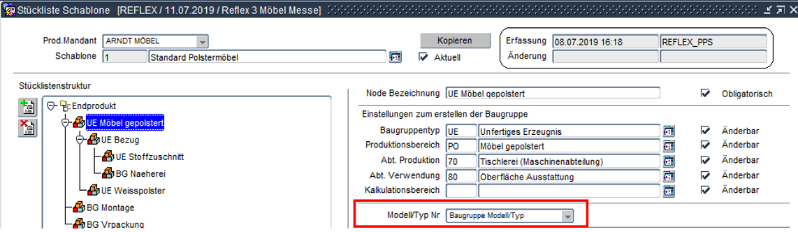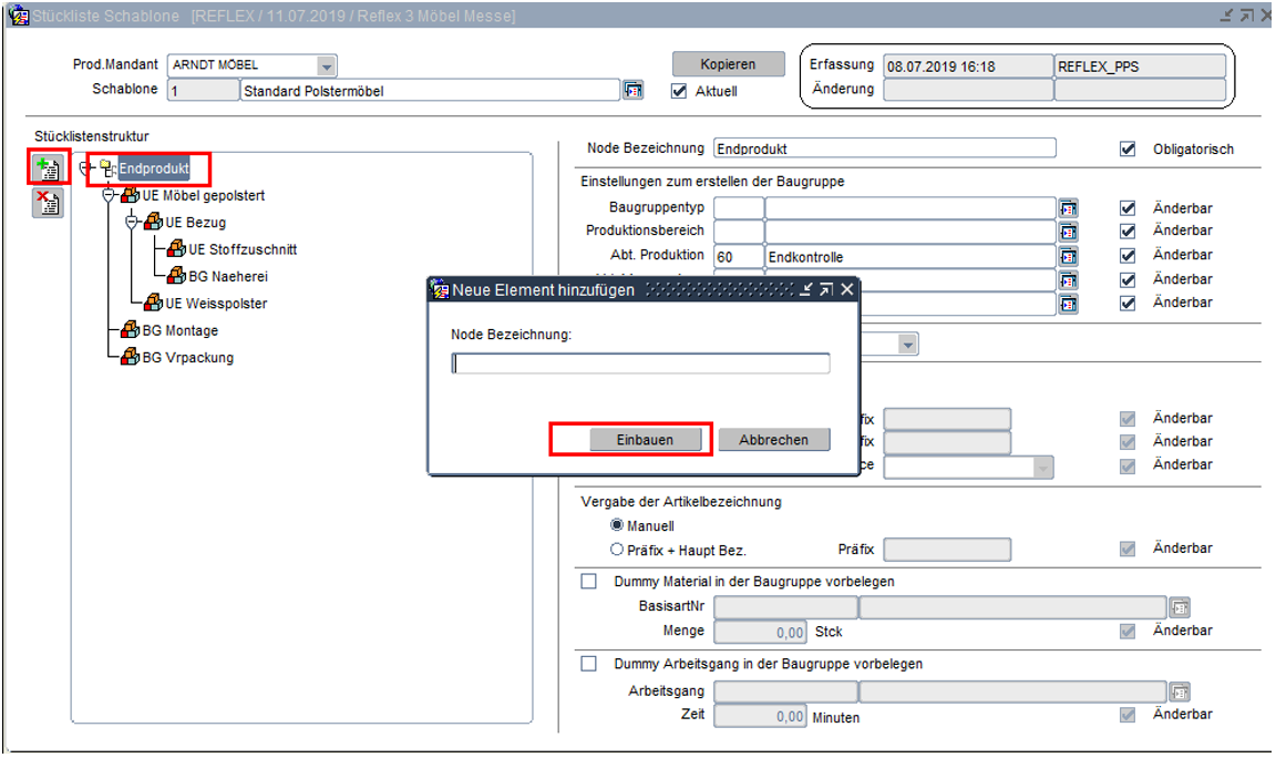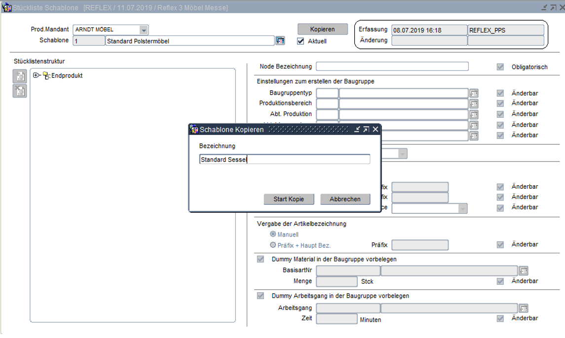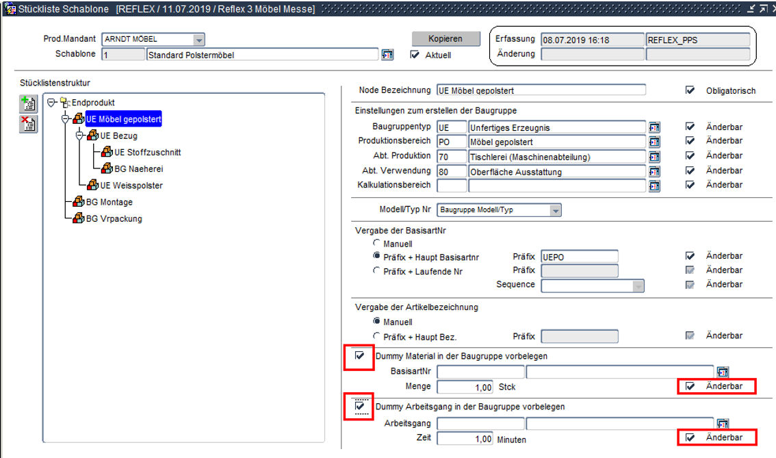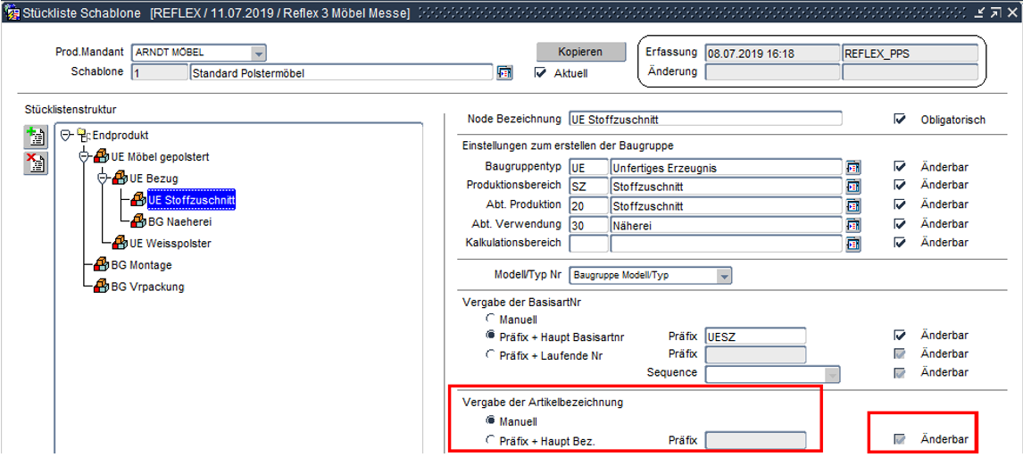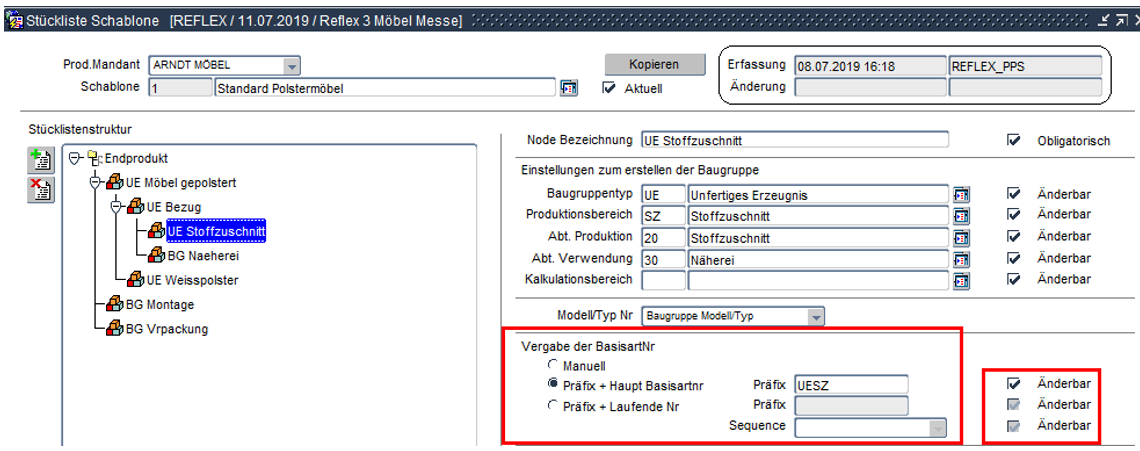 Präfix + Haupt Basisartikel-Nr. = Hier ist ein Präfix (z.B. UENA für unfertiges Erzeugnis Näherei) zu erfassen. Bei der Stücklistenvorbereitung wird dann das Präfix mit der Hauptbasisartikel-Nr. zusammengeführt. (UENA 1 Sitzer mit Armlehnen) Das Element muss dann in der Stücklistenvorbereitung nicht aufwendig manuell umbenannt werden. Ist das Präfix hier auf „änderbar” gesetzt, kann das Präfix später noch geändert werden.