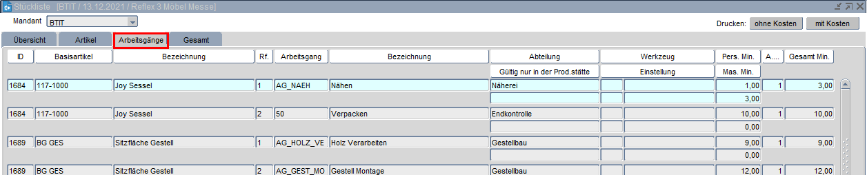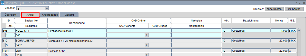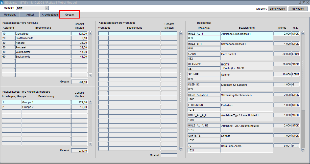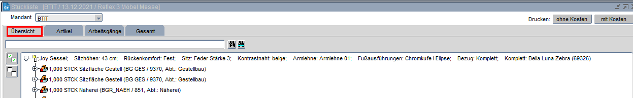 ProduktionStücklistenverwaltungStuecklisten verwalten - StuecklisteStueckliste Test Stueckliste Test - Stueckliste Stückliste - Stücklisten Test War die Stücklistenauflösung erfolgreich, wird das folgende Fenster geöffnet: Hier kann man die verschiedenen Elemente der Stückliste nach unterschiedlichen Kriterien gruppiert sehen.