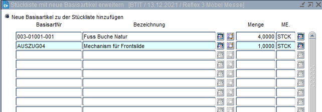 Die Stückliste des Basisartikels umfasst alle Materialien und Arbeitsgänge, die bei der Herstellung des Realartikels, der aus dem jeweiligen Basisartikel gebildet wird, berücksichtigt werden können. Daher müssen alle Möglichkeiten in der Stückliste des Basisartikels berücksichtigt werden, aber nur die durch die Ausprägungen und Regeln definierten Optionen werden effektiv in das Möbel eingebaut.