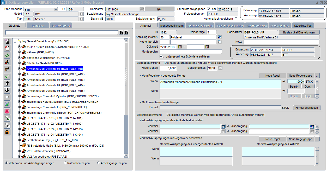 Die Stücklistenverwaltung holt sich die Grundinformation aus dem Basisartikelstamm. In einer Baumstruktur werden alle Baugruppen erfasst. Unter den Baugruppen befinden sich die einzelnen Materialien und Arbeitsgänge. Es können auch direkt Materialien der Stückliste zugeordnet werden. Die Stückliste oder auch einzelne Baugruppen können kopiert oder wiederverwendet werden. Durch eine Regelfunktion können Mengenregeln / Zeitregeln sowie Merkmalregeln erstellt werden. Zum Beispiel kleinere Armlehne bestimmt kleinere Schraube. Durch solch ein Regelwerk hat man die Möglichkeit weniger Stücklisten anzulegen und der Pflegeaufwand bei Änderungen ist mit weniger Zeitaufwand durchzuführen.
