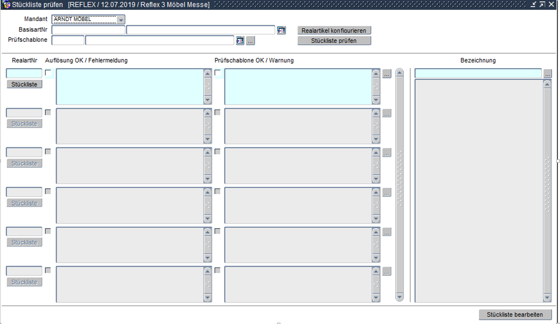 Bei diesem Prüfvorgang werden einzeln die Stücklisten aller genierten Realartikel aufgelöst. Die aufgelöste Stückliste wird anschließend mit den in der Prüfschablone definierten Bedingungen verglichen und in je einer Zeile der Form wird das Ergebnis der Stücklisten-Auflösung dokumentiert.