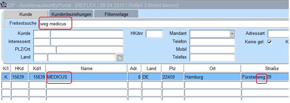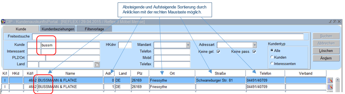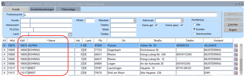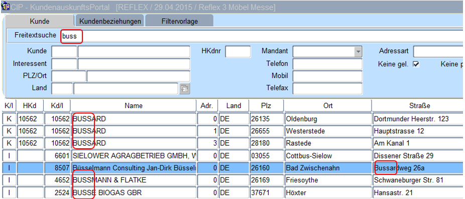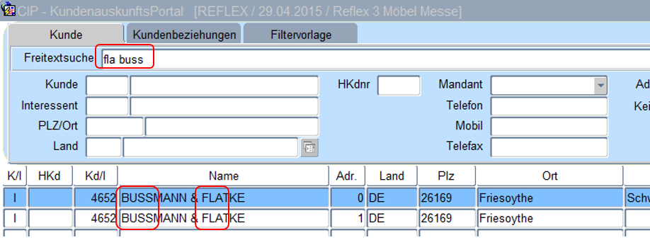 Anders als in der Suche im Kundennamen kann die Eingabe in der Freitextsuche nach „fla buss“ erfolgen. Das System selektiert alle Kundenadressen die in der Adresse die Zeichenfolgen „fla“ und „buss“ aufweisen (die Reihenfolge ist hier nicht von Bedeutung, ein Prozentzeichen wird nicht benötigt).