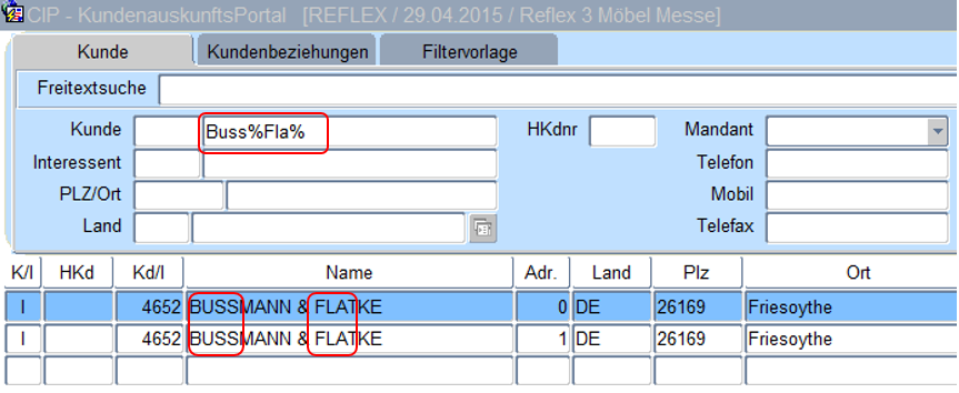 Die Suche im Kundensuchnamen nach „buss%fla%" selektiert alle Kundenadressen die im Suchnamen die Zeichenfolge „buss“ und „fla“ (genau in dieser Reihenfolge) enthalten. Achtung, ein Leerzeichen ist auch ein Zeichen, was vom System abgeglichen wird.