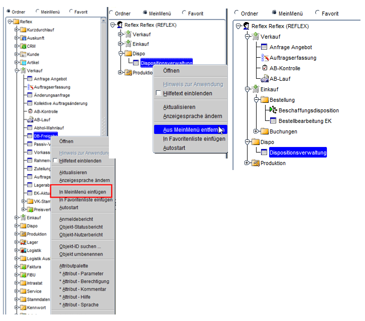 Genauso wie bei der Festlegung seiner Favoriten, kann der Anwender die jeweilige Anwendung über das Kontextmenü (linke Maustaste) für das „MeinMenü“ aufnehmen und wieder entfernen.