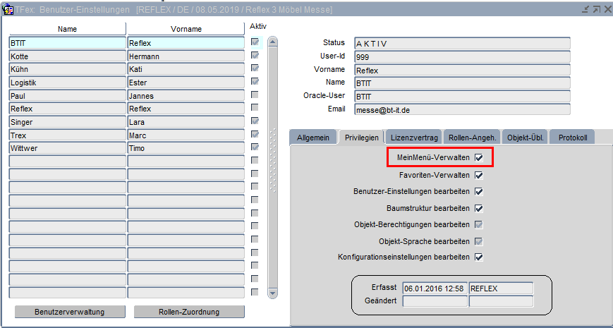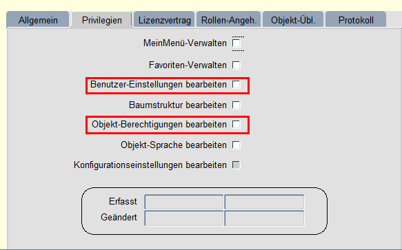 Der Benutzer benötigt die Berechtigung „Objekt-Berechtigungen bearbeiten“, um die Rollen-Zuordnung und Benutzer-Einstellung zu bearbeiten. Ein User mit dieser Berechtigung kann Berechtigungen für andere User für Menüpunkte vergeben, die er selbst sieht. Um Benutzer-Einstellungen (z. B. Rollen-Verwaltungen und weitere Berechtigungen) zu verwalten, reicht die gleichnamige Berechtigung „Benutzer-Einstellungen bearbeiten“