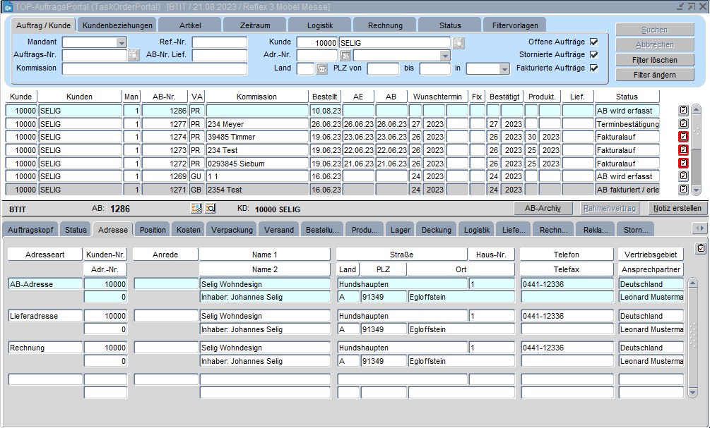 Im Auftragsportal Adresse werden die AB-Adresse, Lieferadresse und Rechnungsadresse des selektierten Auftrages mitsamt der Telefon- und Telefax-Nummer angezeigt. Der Button rechts oben in der Registerkarte Adresse wechselt in die Notizanzeige. Diese Schaltfläche wird in rot markiert, wenn eine Adressnotiz erfasst wurde.