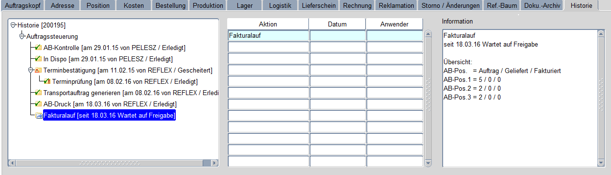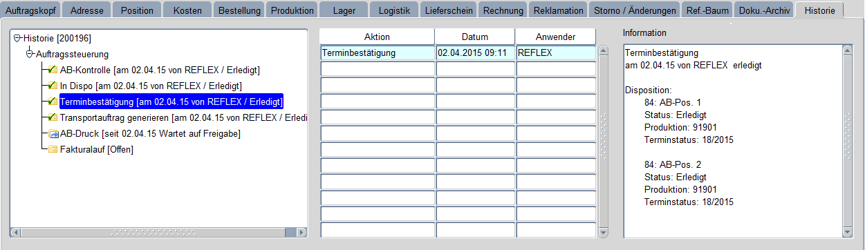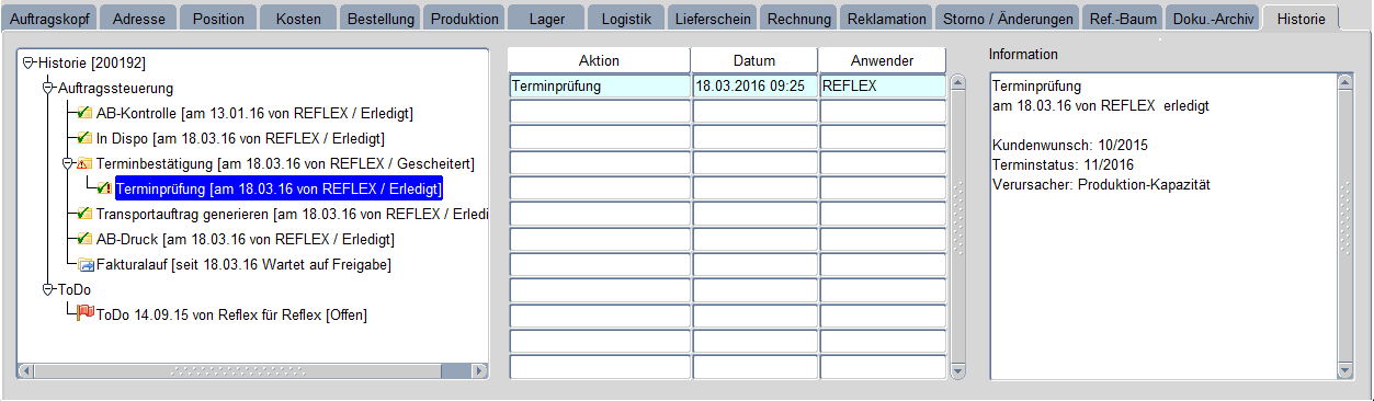 Das Register Historie zeigt alle Auftragsschritte, auch die noch anstehenden, an. Fehlerschritte wie z. B. fehlgeschlagene Passivprüfung bzw. DB-Prüfung sind eingerückt. Notizen und Todo’s werden getrennt im Baum aufgelistet. Im Feld Informationen werden entsprechende Informationstexte ausgegeben.