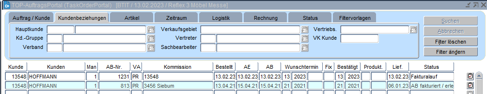 In der Registerkarte Kundenbeziehungen können die Aufträge nach Hauptkunde, Kundengruppe, Verband, Verkaufsgebiet, Vertreter und/oder nach Sachbearbeiter gefiltert werden. Die Ermittlung der anzuzeigenden Aufträge kann mandantenübergreifend über verschiedene Suchkriterien in den Registerkarten Auftrag/Kunde, Kundenbeziehungen, Artikel, Zeitraum, Logistik, Rechnung und/oder Status erfolgen. Grundsätzlich werden alle Suchkriterien in den verschiedenen Registerkarten kombiniert berücksichtigt.