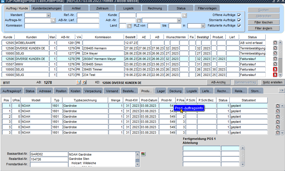 Über einen rechten Mausklick auf der Prod-AB-Nr. lässt sich ein Popup-Menü öffnen, mit dem direkt in die Produktionsuftragsinfo gewechselt werden kann.
