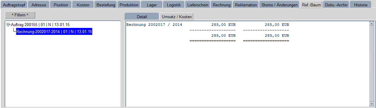 Die Registerkarte Referenzbaum – Umsatz/Kosten zeigt die Werte des Auftrages bzw. der Rechnung an.