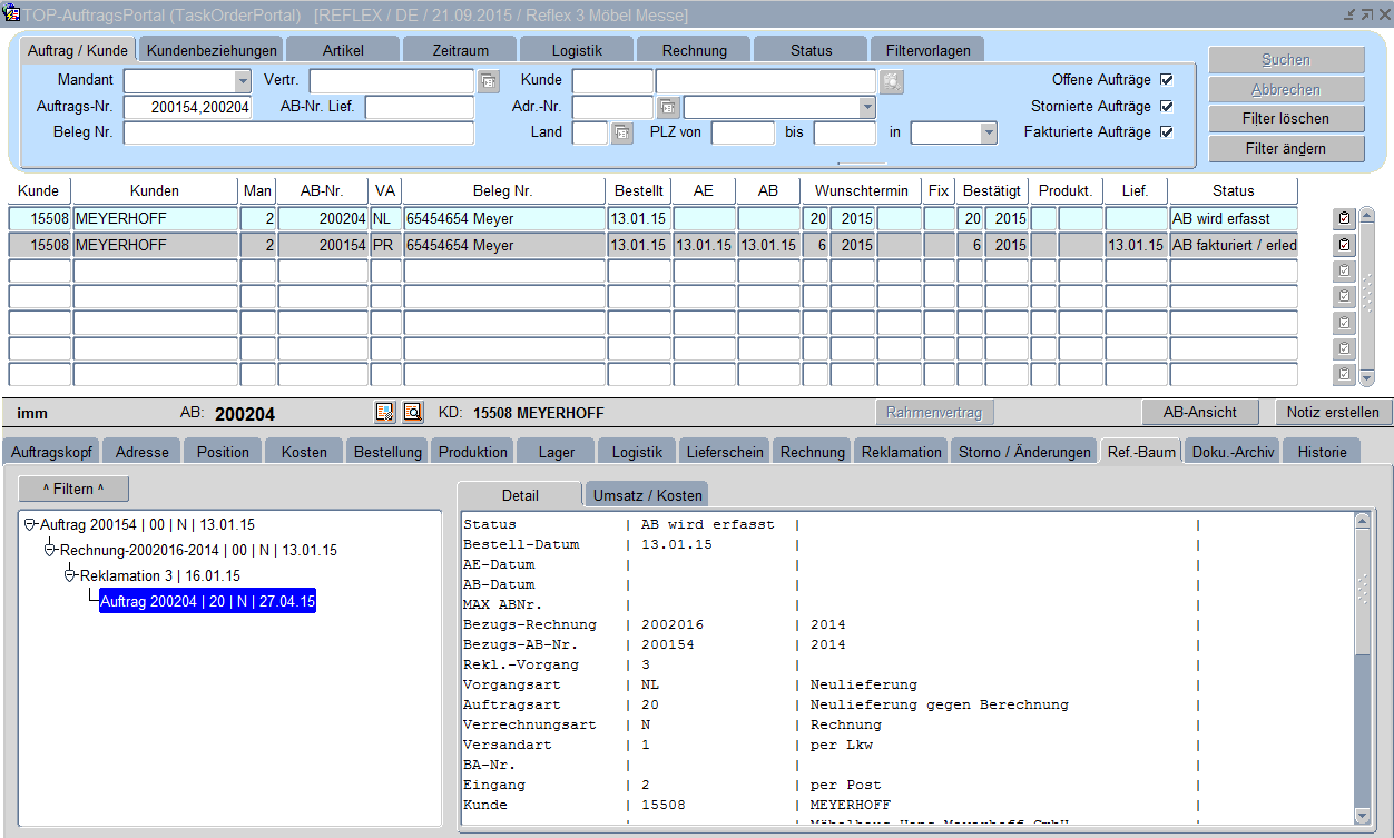 Die Abfolge verschiedener Vorgänge zu einem Auftrag wird in der neuen Registerkarte Referenzbaum - Detail übersichtlich dargestellt. Über die Schaltfläche „Filtern" besteht die Möglichkeit, alle Aufträge zu einem Vorgang (z. B. Auftrag mit Gutschrift bzw. Rechnung zur Gutschrift) aufzulisten.