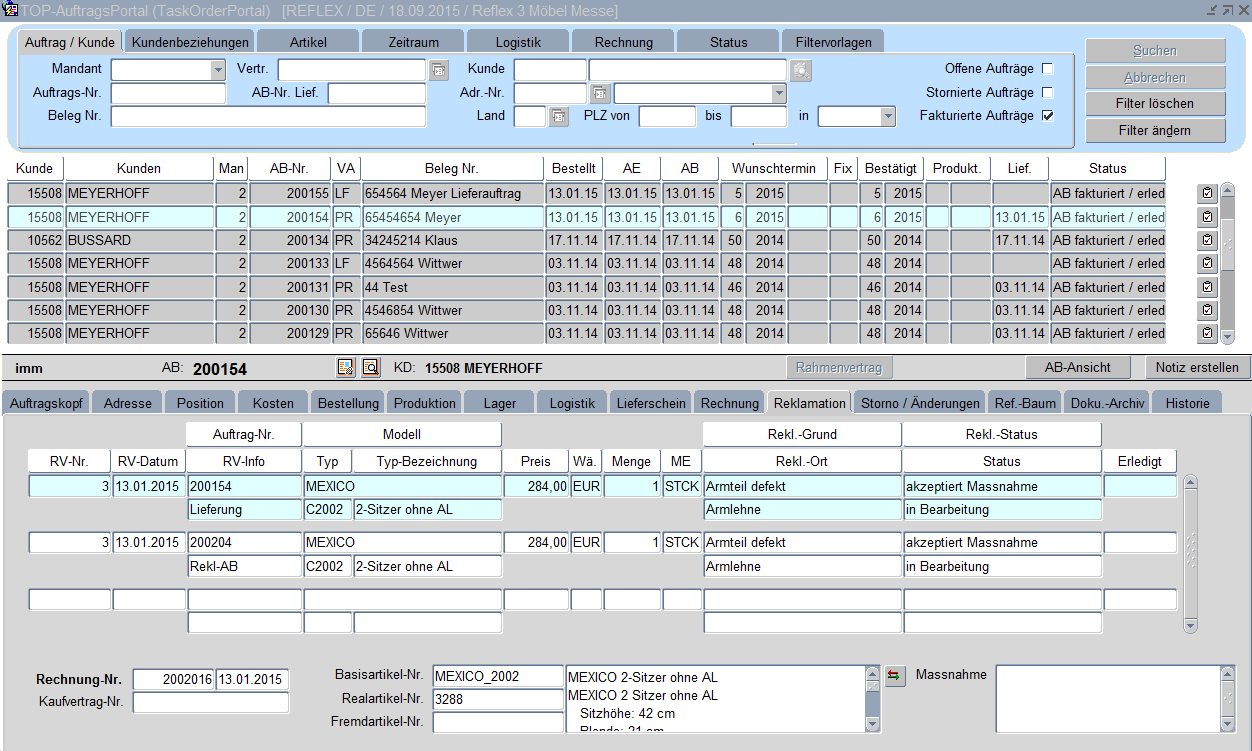 Besteht für ein Auftrag ein Reklamationsvorgang, werden die Daten incl. Reklamationsgrund, Maßnahmen und Status an dieser Stelle ausgegeben.
