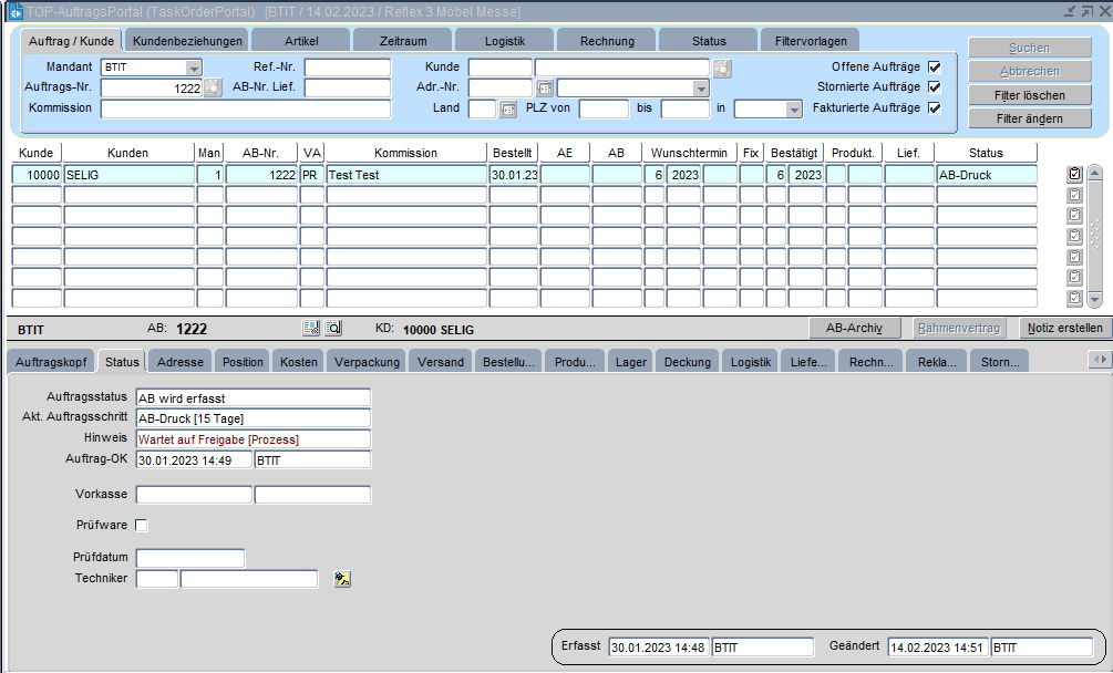 Auf dieser Registerseite ist der Status des Auftrages und der nächste Auftragsschritt zu sehen. Hinweise auf Freigaben und zur Vorkasse werden ebenfalls angezeigt.