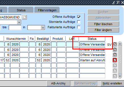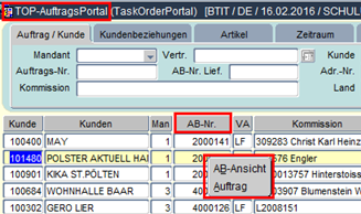 Nummer des Auftrages. Mit der rechten Maustaste auf dem Feld AB-Nr. kann ein Kontextmenü geöffnet werden (vorausgesetzt die Berechtigung zur Anzeige von VK-Preisen ist vorhanden). Hier hat man die Möglichkeit, über den Punkt "AB-Ansicht" den AB-Druck der markierten AB zu starten bzw. über den Menüpunkt "Auftrag" in die Auftragserfassung zu wechseln. Hierbei wird die aktuell markierte AB automatisch angezeigt.