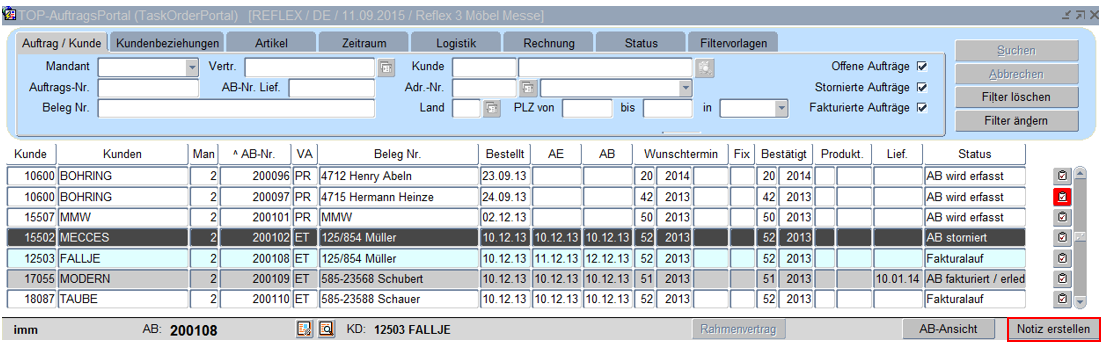 Über den Button "Notiz erstellen" wird die Notizerfassung geöffnet. Der Button neben der Postion zum Einsehen von Notizen erscheint rot, wenn bereits Daten zum Auftragskopf erfasst wurden. Schwarz unterlegte Aufträge sind storniert worden. Grau unterlegte Aufträge sind bereits fakturiert.