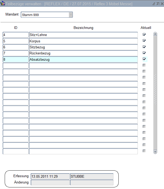Die Verwaltung und Anzeige aller Teilbezüge die angeboten werden (noch nicht bezogen auf die Modelle oder Typen) werden in dieser Maske angelegt und gepflegt. Die Zuordnung der Bezugskombination und einzelnen Teilbezüge findet in der Registerkarte Bezug der Basisartikelverwaltung statt.