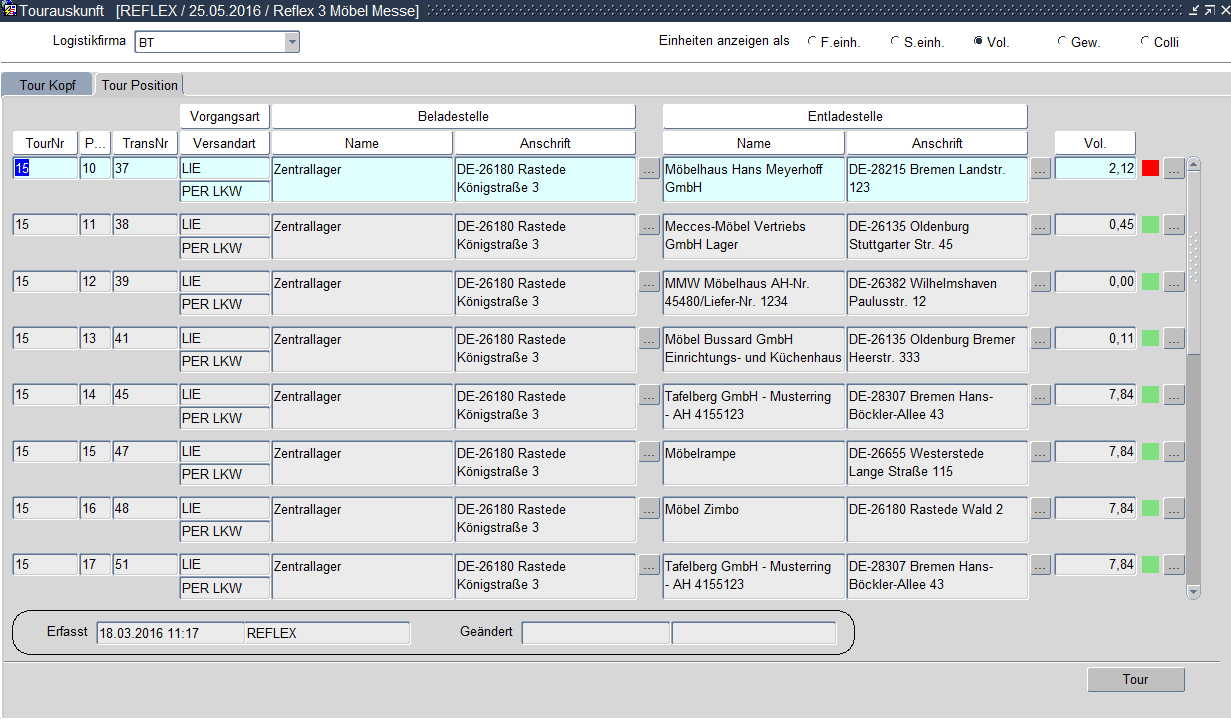 Mit einem Mausklick auf das farbige Kästchen wird die Form Lagerbestand mit den Daten des entsprechenden Transportauftrages aufgeblendet.