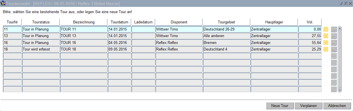 Zur Tourenplanung der gekennzeichneten Transportaufträge werden hier sämtliche Touren aufgelistet, deren Tourstatus entweder "Tour wird erfasst" oder "Tour in Planung" ist. Die gewählten Transportaufträge können nun in eine bestehende oder bei Bedarf über den gleichnamigen Button in eine neue Tour verplant werden.