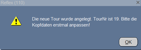 Mithilfe des Buttons „Neue Tour" wird aufgrund der gekennzeichneten Transportaufträge eine völlig neue Tour erstellt. Es erscheint eine Meldung mit der neuen Tournummer und der Bitte um Erfassung der Tourkopfdaten. Nach Bestätigung dieser Meldung wird die Tourenplanung mit den entsprechenden Daten geöffnet. Hier kann die Tour beliebig vervollständigt, geändert und / oder verfeinert werden.