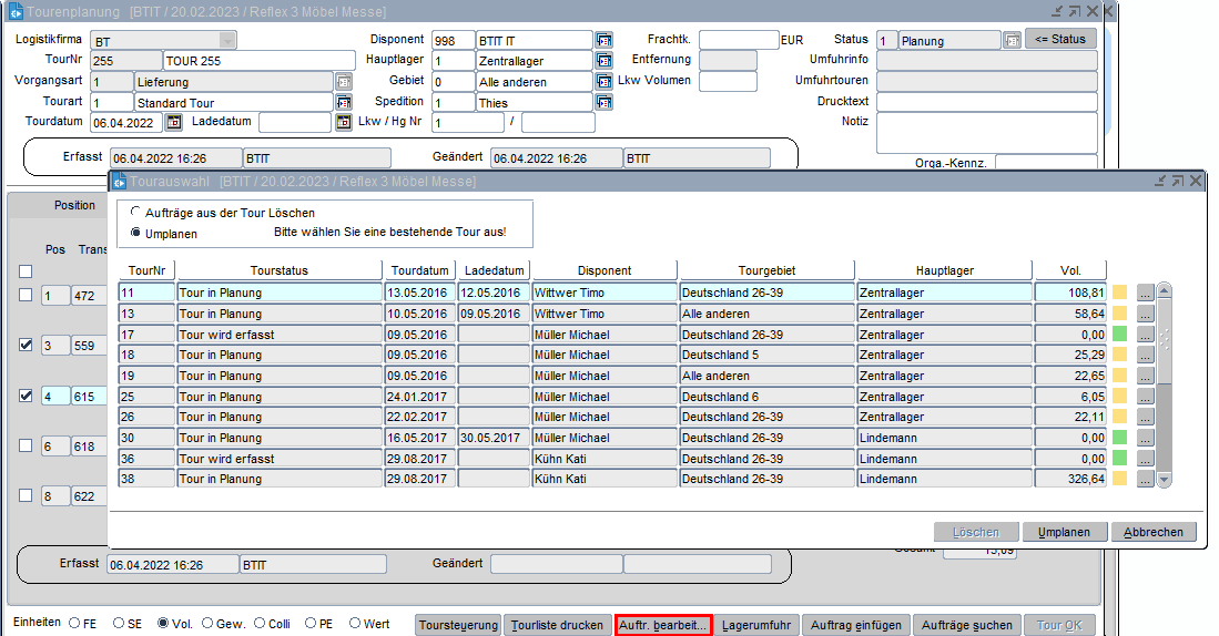 Über den Button "Aufträge bearbeiten" in der Tourenplanung besteht die Möglichkeit mehrere Aufträge einer Tour zu löschen oder in eine andere Tour zu verschieben. Hierfür markieren Sie bitte das Kontrollkästchen links neben den zu bearbeitenden Aufträgen in der Ausgangsmaske und klicken den Button "Aufträge bearbeiten" Hier treffen Sie die Auswahl des entsprechenden Button im Kopf (Aufträge aus der Tour löschen oder Umplanen". In einer neuen Maske erscheinen sämtliche Touren. Für eine Umplanung muss die richtige Tour gewählt werden. Durch Drücken des Buttons "umplanen" werden die markierten Aufträge in die ausgewählte Tour verschoben.
