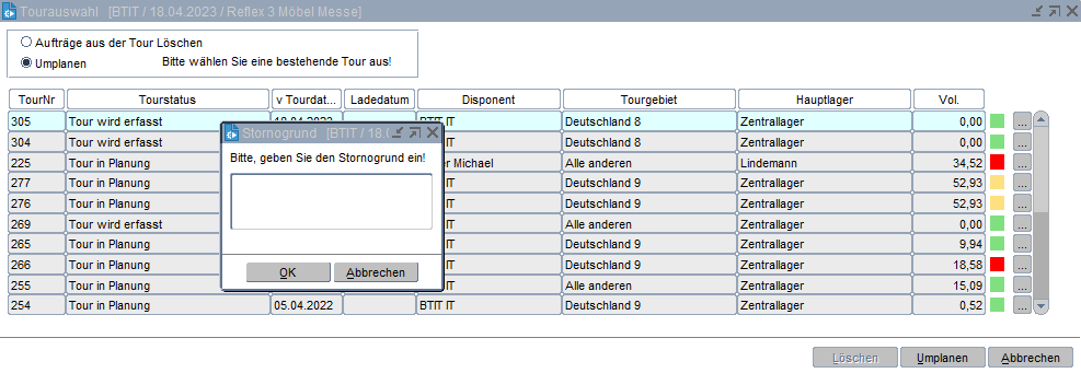 In beiden Fällen geht ein Fenster zur Erfassung des Stornogrundes auf. Mit der Bestätigung über den Button „OK“ wird die Aktion durchgeführt – eine Meldung wird vom System ausgegeben.