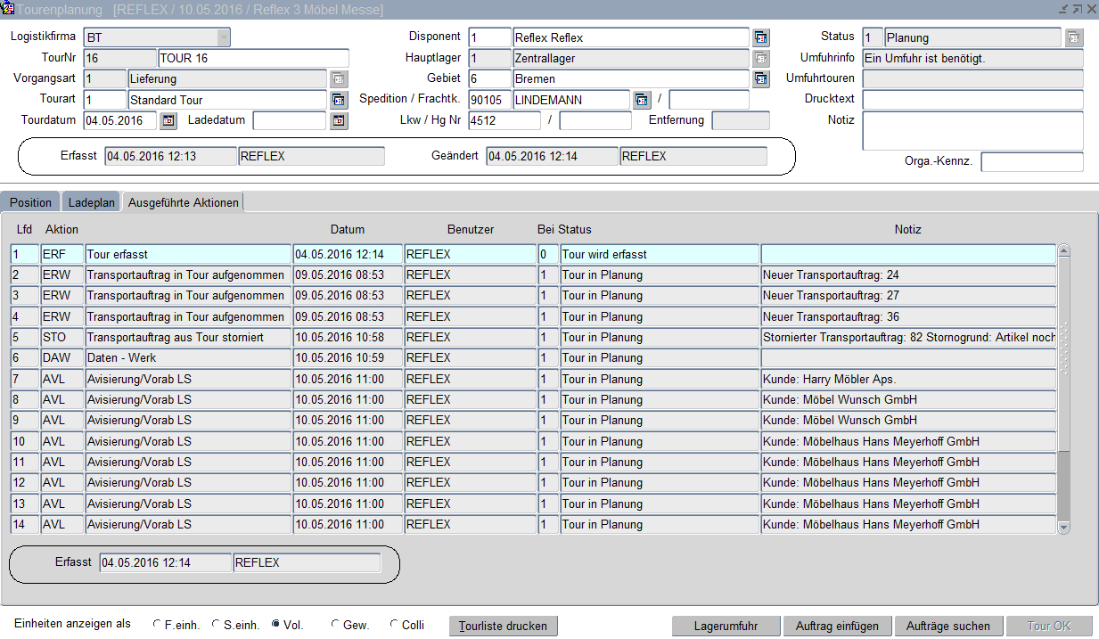 Auf dieser Registerkarte sind die Aktionen aufgeführt, die bezüglich der Tour durchgeführt wurden.