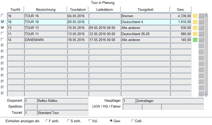 Mithilfe der Kontrollkästchen links der Tournummern sind die Touren zu kennzeichnen. Die einzelnen Aktionen werden immer für die gewählten Touren ausgeführt. Die meisten Aktionen (z. B. Ladeliste,Lieferscheindruck) können für mehrere Touren gleichzeitig durchgeführt werden, andere hingegen (z. B. Beladung beginnt, Verladung melden) können nur für eine einzelne Tour angestoßen werden.