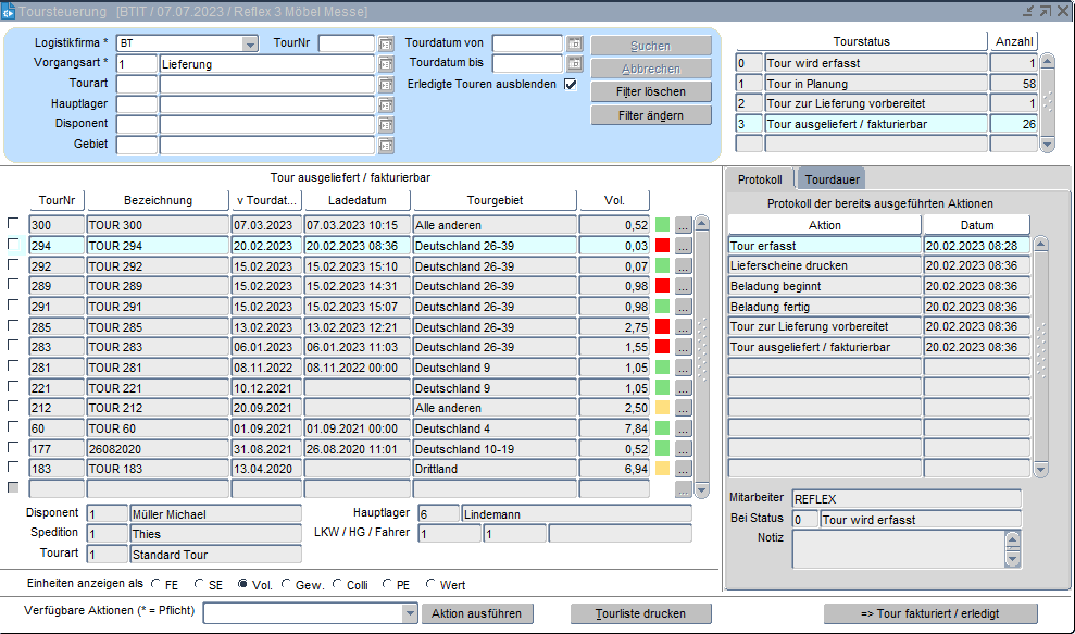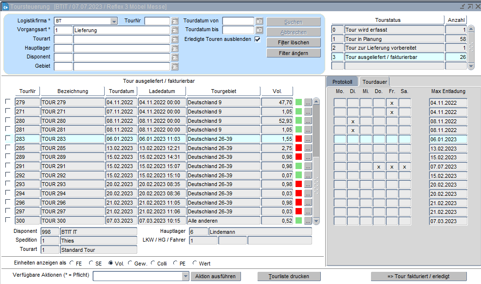 -Rechts neben den Touren werden die sogenannten Protokolldaten der eben ausgewählten Tour angezeigt. Hier sind sämtliche Aktionen in chronologischer Reihenfolge zusammengefasst, wobei genau nachzuvollziehen ist, wer welche Aktion wann ausgeführt hat. Es besteht außerdem die Möglichkeit die Registerkarte "Tourdauer" über die System-Konfiguration einzublenden, in der die Wochentage der Entladetage und das höchste Entladedatum vermerkt sind.