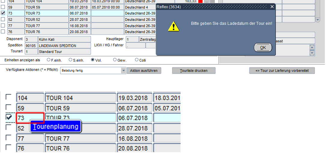 Beim Wechsel des Tourstatus von Status 1 auf den Status 2 kann eine Prüfung auf das Ladedatum erfolgen. Wenn noch kein Ladedatum erfasst wurde, wird eine entsprechende Meldung ausgegeben. Über das Kontextmenü auf der Tour-Nr. kann in die Tourenplanung gewechselt werden, um das fehlende Ladedatum zu erfassen.