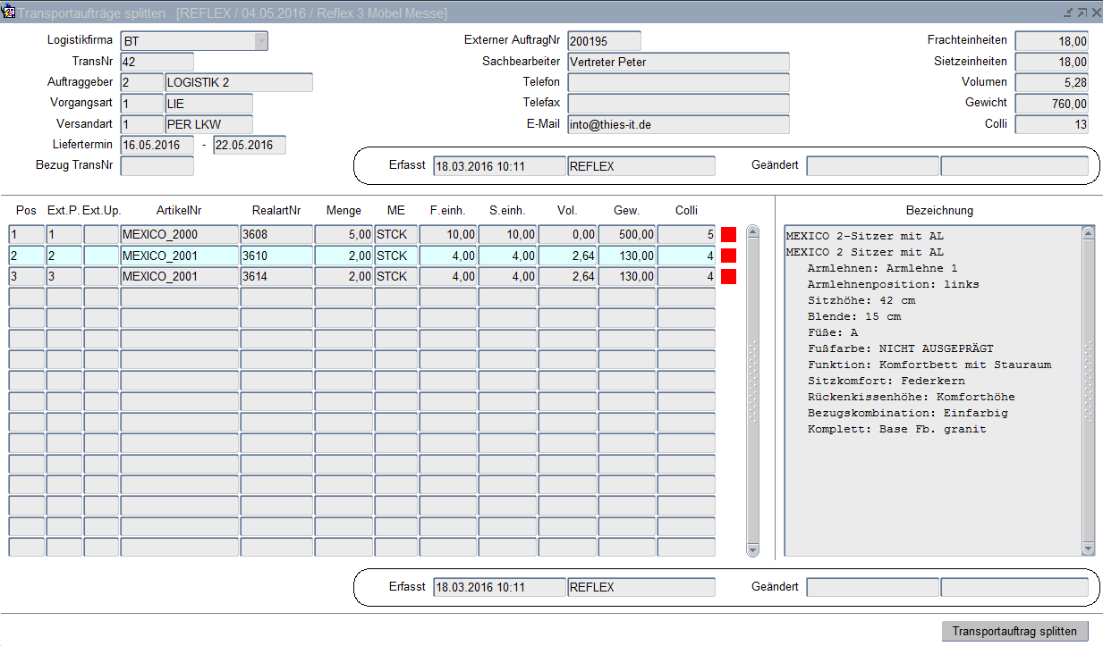 Mit dem Button „Transportauftrag splitten" wird eine neue Maske geöffnet, in der die Auftragspositionen aufgeteilt werden können.