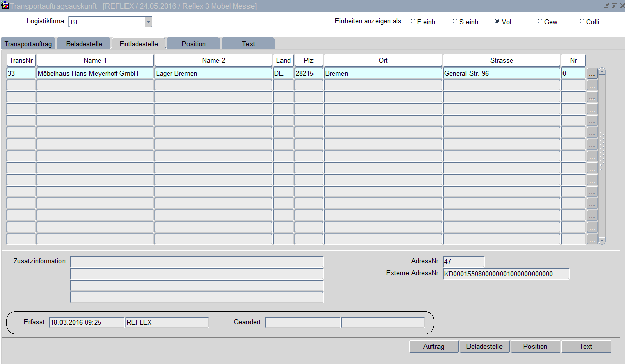 -Button anzuklicken – die Maske „Transportadresse" wird aufgerufen.