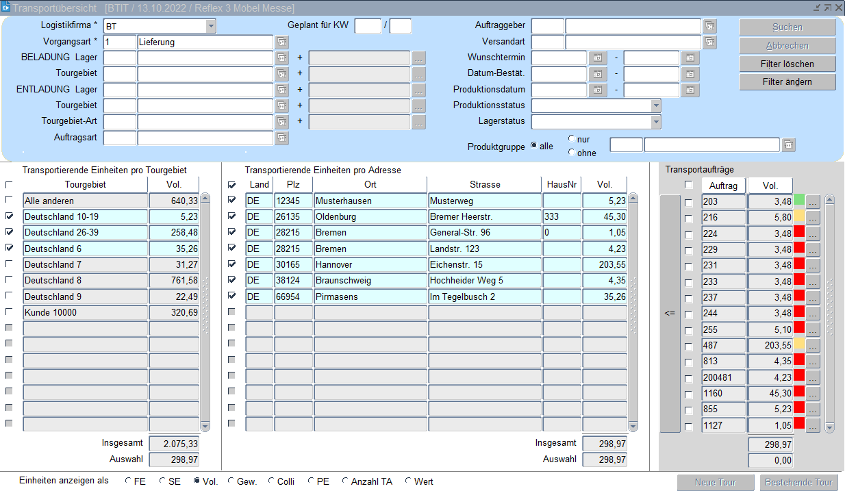 Die Anwendung dient zur Abfrage und zur automatischen Tourenplanung der zu transportierenden, noch nicht in Tour verplanten Transportaufträge. Für die Suche der entsprechenden Transportaufträge stehen zahlreiche Filter zur Verfügung. Die selektierten Aufträge werden nach Tourgebiet gruppiert, dargestellt.