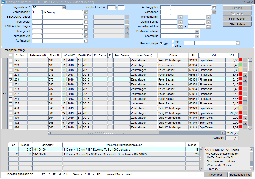 Mit einem Mausklick auf das farbige Kästchen wird die Form Lagerbestand mit den Daten des entsprechenden Transportauftrages aufgeblendet.