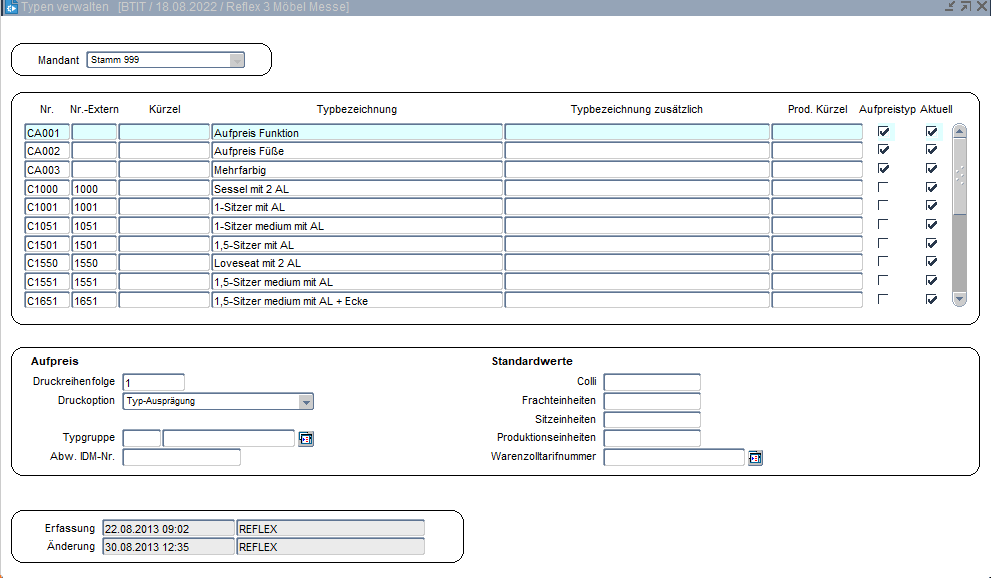 Diese Maske dient der Verwaltung und Anzeige aller Typen, die angeboten werden (noch nicht bezogen auf die Modelle). Oftmals sind die Typen eines neuen Modells bereits angelegt. Bei Neueingabe der Typen sollte darauf geachtet werden, dass die Nummer und Typbezeichnung mit den Vertriebsunterlagen übereinstimmt, da die Möbelstücke entsprechend in der Auftragsverwaltung erfasst werden.