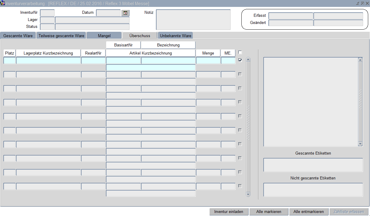 "Überschuss": Artikel, die laut Zählliste nicht oder nicht in einer geringeren Menge im Lager sein sollten werden hier aufgeführt.