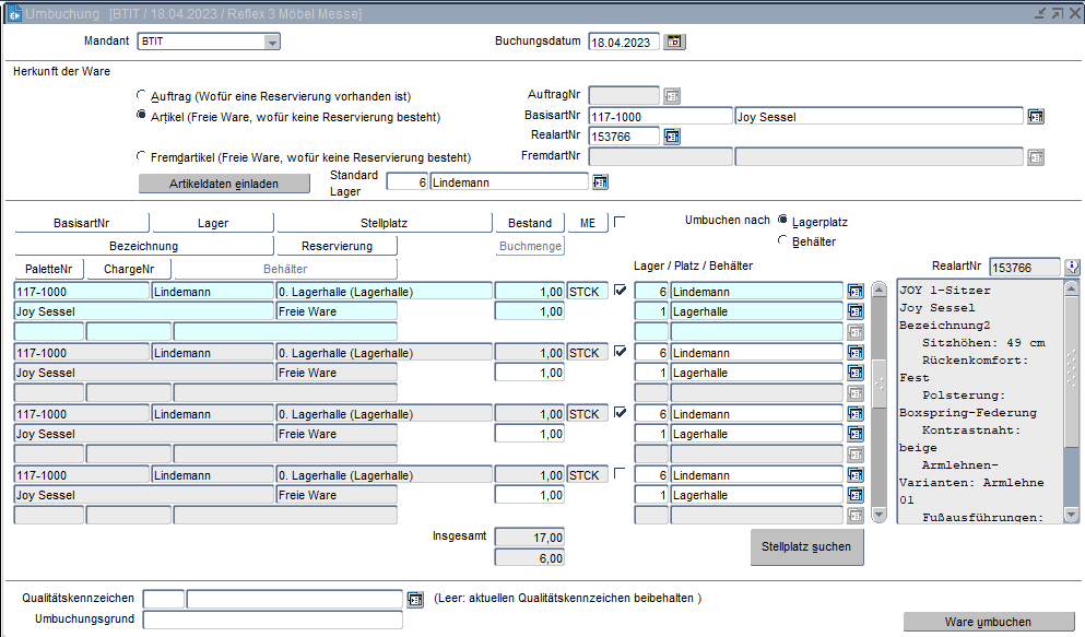Mit dem Button "Ware umbuchen" wird die Umbuchung der Ware vorgenommen. Eine Meldung der erfolgten Umbuchung erscheint.