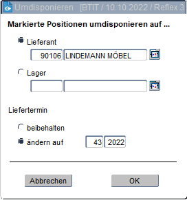 Soll eine Lieferantenbestellung von einem Lieferanten zum anderen Lieferanten verlagert werden, kann die Umdisponierung in dieser Maske stattfinden.