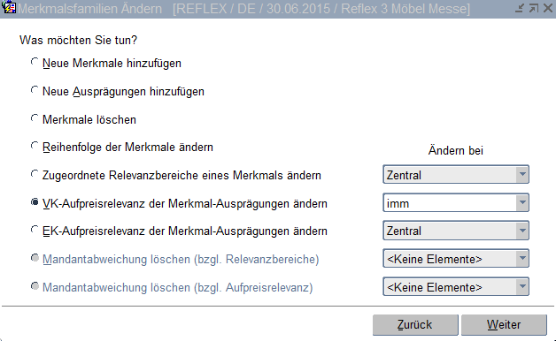 Merkmalsfamilie Änderungen - VK-Aufpreisrelevanz der Merkmal-Ausprägungen ändern