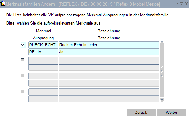 Mit dem Button "Weiter" öffnet das System eine weitere Maske, in der alle VK-aufpeisbezogenen Merkmalsausprägungen angezeigt werden. Hier kann die VK-Aufpreisrelevanz durch Anklicken des Kästchens aktiviert bzw. durch Herausnehmen des Häkchens deaktiviert werden.