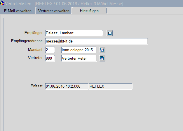 Nach dem Hinzufügen der neuen E-Mail Adresse erfolgt die Zuordnung des Mandanten (Werteliste) und der Vertreternummer (Werteliste) von welchem Vertreter die Listen an die erfasste Empfängeradresse gesendet werden soll in der Registerkarte "E-Mail verwalten". Die Registerkarte „Vertreter verwalten“ zeigt alle Empfängeradressen.