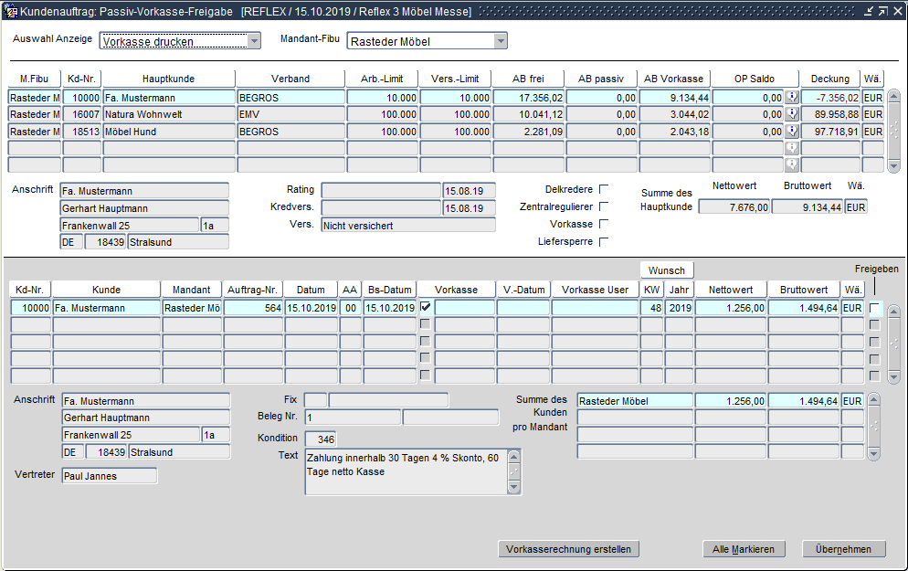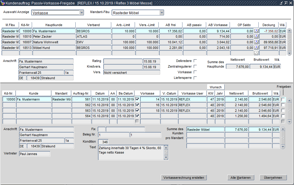 Mit dieser Anwendung kann über den Vorkasselauf für einzelne oder alle Aufträge die Vorkasse-Rechnung erstellt werden. Damit die Vorkasse-Aufträge überhaupt in dieser Form auflaufen, muss die Auftragsartsteuerung den Auftragsschritt "900 - Passivprüfung" beinhalten.